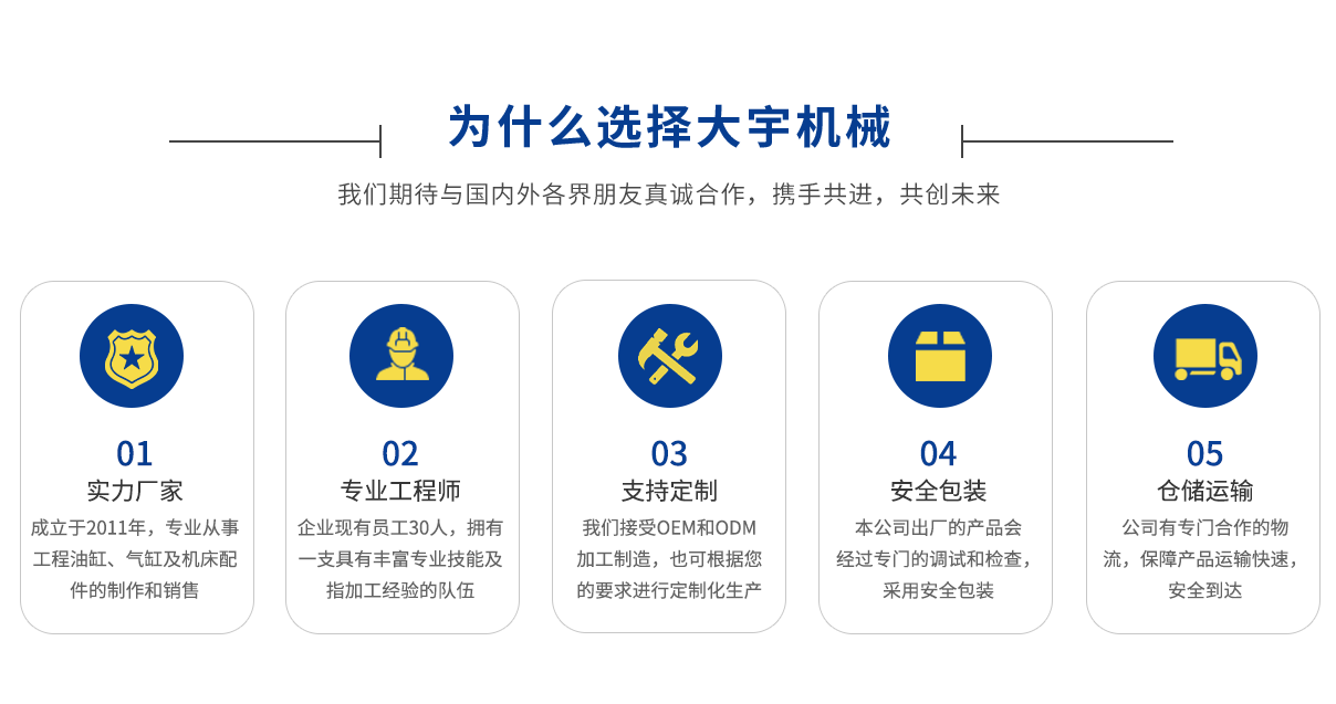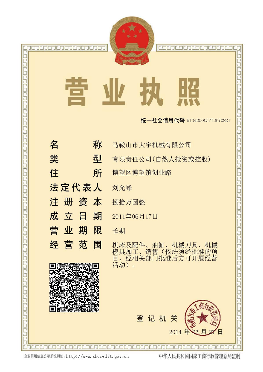 - 馬鞍山市大宇機(jī)械有限公司 INTRODUCTION 馬鞍山市大宇機(jī)械制造有限公司成立于2011年06月,注冊(cè)資本80萬(wàn)元人民幣,位于博望區(qū)博望鎮(zhèn)鎮(zhèn)西工業(yè)園區(qū),占地4000平方,主要從事壓料缸,油缸,氣缸,折彎?rùn)C(jī)夾模板及機(jī)床配件的制造和銷(xiāo)售。...